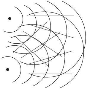 Как же возникло предположение о том, что два состояния могут существовать одновременно? Здесь самое время напомнить об эксперименте Фейнмана пятидесятилетней давности. Если в бак с водой помещено устройство, движущееся вверх-вниз и создающее волны, исходящие из двух разных источников, то волны эти будут пересекаться. В конечном итоге вследствие их пересечений мы получим модель, которая называется «интерференцией волн» (см. чертеж 1) и представляет собой множество точек их сложения. Явление это хорошо известно, и можно с легкостью вычислить положение таких точек.