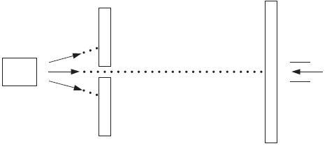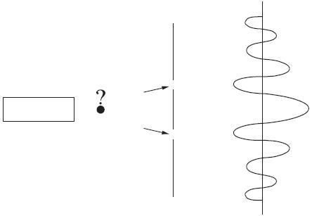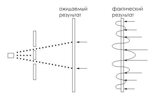 Теперь слегка изменим условия эксперимента, поставив перегородку с двумя отверстиями. Ожидаемым нами результатом стало бы попадание частиц в две разные и вполне определенные точки экрана – аналогично тому, что происходит в предыдущем эксперименте с одним отверстием. Однако на деле, если мы хорошо организуем эксперимент и выдержим определенное соотношение между размерами частиц и размерами отверстий в перегородке, результат будет отличаться от ожидаемого. Мы обнаружим, что частицы попадают в экран по всей его длине, а не только в тех двух точках, где мы предполагали их найти.