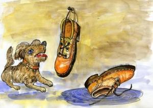 Неизвестно, что было бы с ними дальше, если бы не прибежала задорная собака. Увидев висящий на заборе ботинок, она захотела с ним поиграть и прыгала до тех пор, пока не сорвала Башмак с забора.