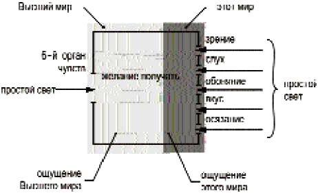 Как это происходит? Наш мир мы воспринимаем при помощи зрения, слуха, обоняния, осязания и вкусовых ощущений, но имеется еще дополнительный, шестой орган чувств, называемый экраном. Используя его, можно проникнуть сквозь наш мир и увидеть глубинные, внутренние слои. Итак, человек должен обрести дополнительный орган чувств.
