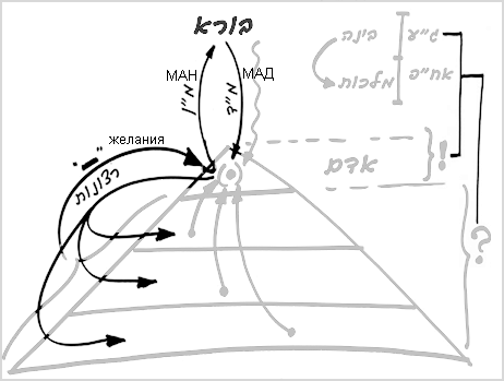 Поэтому мы, находясь на уровне точки в сердце, прежде всего достигаем желания к Творцу, формируем МАН (просьбу, молитву). Откуда в нас возникает этот МАН, эта просьба? Только из ощущения потребности всего остального мира, которую он передает нам, а мы чувствуем его страдания. То есть мы обязаны соединиться со всем миром, не отдаляться от общества – "среди своего народа я живу". Мы должны взять все отрицательные желания общества, поднять их к Творцу, получить от Творца в ответ силу, которая называется МАД и с этой силой начать работать относительно мира, передавая ему свет. Свет не может достичь их непосредственно, он может прийти только через нас, т.е. через свойство бины к малхут. Бина – это мы, ГЭ, а малхут – это они, АХАП.