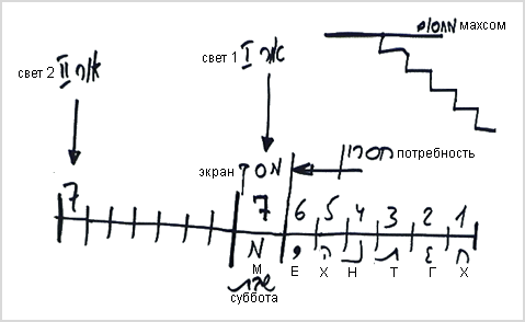 Слово шабат (суббота) происходит от слова швита (отдых) - я уже не должен ничего делать. Я уже подготовил себя, и теперь работает свет. Затем из седьмого дня, в котором я получил свет, я вновь выхожу на следующую семидневку и прохожу 6 сфирот - хэсэд, гвура, тифэрэт, нэцах, ход, есод. После этого вновь наступает седьмой день, и я вновь получаю свет - это уже следующая, более высокая ступень. Таким образом я поднимаюсь со ступени на ступень, пока не достигаю уровня махсома. Такова наша работа.