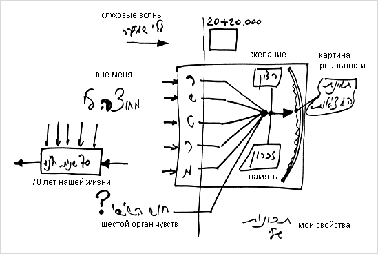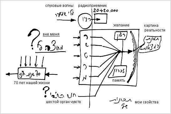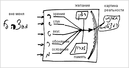 Все они концентрируются во мне, обрабатываются вместе с моими памятью и желанием, появляются у меня на экране в задней части головы и создают мне некую картину, как в кино. На этом экране я вижу картину реальности.