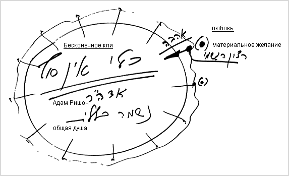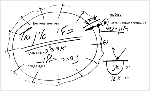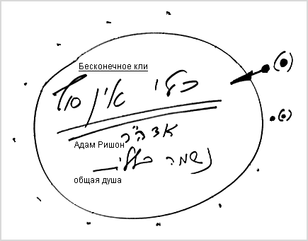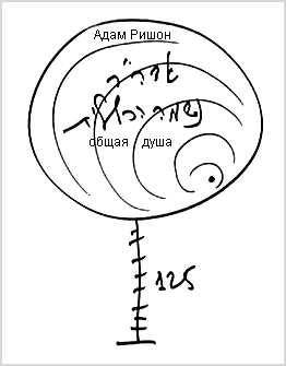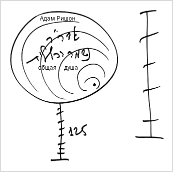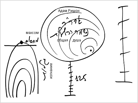 Мы присоединяемся к общей исправленной душе. Сами мы души не исправляем. Как я изобразил на чертеже, мы присоединяемся к чему-то совершенному. И это мир Бесконечности, в котором существует общая душа – Адам Ришон. А я нахожусь от нее, если можно так сказать, в мере 125 ступеней приближения к ней. Но более правильно сказать, что я нахожусь внутри нее и начинаю ее познавать по 125 ступеням, пока не познаю целиком. А первая ступень называется «махсом».