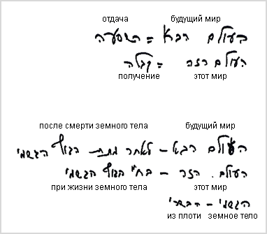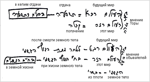 Мы не должны путаться в этих определениях. Поэтому нужно хорошенько объяснить всем, что у нас есть два языка – "язык низших" и "язык высших". И потому этим миром называется или то, что я сейчас ощущаю чувственно, или же этим миром называется то, что я воспринимаю в келим получения. Будущим миром называется либо то, что я умираю и освобождаюсь от тела, как мы думаем в этом мире (это называется "мнение обывателей"), либо будущим миром называется восприятие в келим отдачи, и это – "мнение Торы".