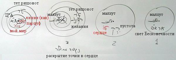 В чём разница между мной нынешним и мной в мире бесконечности? В мире бесконечности я нахожусь в точке. А разница между тем, каков я был в мире бесконечности, и моим нынешним состоянием в том, что эта точка получила в дополнение некий большой шар, или как мы рисуем окружность вокруг точки, где находятся все мои желания. Этот круг – моё сердце, а точка, что внутри него – точка в сердце.