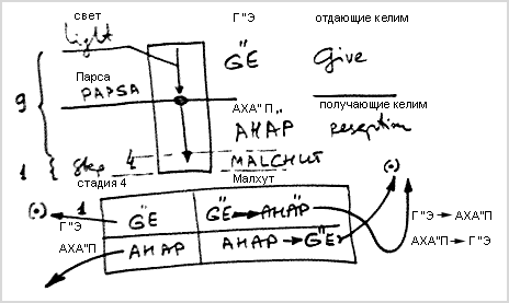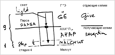 Мы учим, что в мире Некудим существовало кли, которое изначально было разделено на две части: Гальгальта Эйнаим (Г”Э) - отдающие келим и АХА”П – получающие келим. В отдающих келим пребывал свет, а в получающих келим не было ничего. Отдающие и получающие келим разделяла Парса.