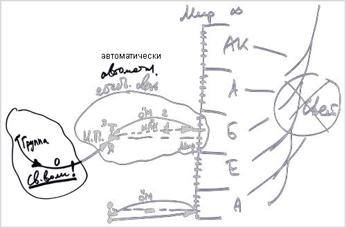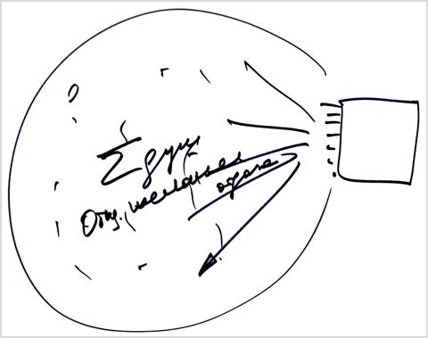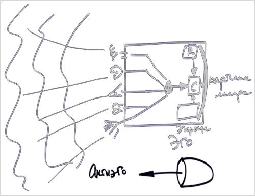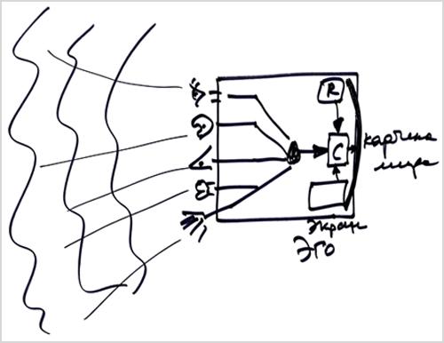Отсюда передается информация внутрь человека. Здесь она сводится к одному типу информации и поступает на некое распределительное устройство, связанное с запоминающим устройством. Затем информация идет через сравнительное устройство для выдачи какого-то сигнала. И в итоге мы получаем на экране, находящемся в задней части мозга, картину мира.