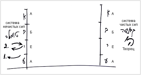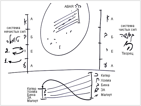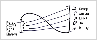 Нужно только учитывать, что части низшего парцуфа получают свет от соответствующих частей высшего парцуфа. Малхут высшего совершает отдачу Кетеру низшего, однако все категории низшего получают отдачу от соответствующих категорий высшего. Книга чертежей Илан изображает, как миры АБЕА получают отдачу от мира Адам Кадмон: каждый раз это происходит между соответствующими частями. Я могу показывать какие-либо картины твоему взору, но не слуху и не обонянию – на какой бы ступени ты ни находился.
