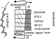 Это желание разделено на пять частей: зрение, слух, запах, вкус, осязание. В таком виде я получаю впечатления внутри моего желания, и мне кажется, будто что-то находится вне меня, какой-то внешний мир. Я не знаю, что такое внешнее - это лишь некое ощущение, создающее впечатление, что объект находится не внутри меня, а снаружи. Так представляется мне внутри желания, которое разделилось на две части: меня и внешний мир. В терминах науки каббала это корень, душа, тело, одеяние и дворец (внешнее пространство).