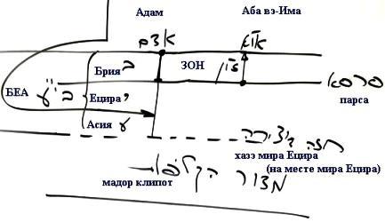 миры БЕ"А поднимаются выше парсы на место сфирот бина, тиферет и малхут дэ-Ацилут (куда можно подняться в течениe 6000 лет), и "одевают" мир Ацилут, то есть получают свет в месте его свечения.