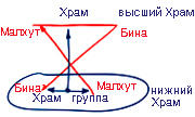 Связь высшего с низшим произошла от подъема Малхут в Бину, а затем спуска Бины в Малхут. Отсюда есть два Храма. Малхут и Бина, находящиеся внизу, - Нижний Храм, а Малхут и Бина наверху – Высший Храм.
