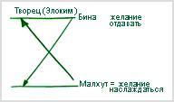 Благодаря этому взаимопроникновению бины и малхут у нас появляется возможность исправить себя. Ведь малхут, сама по себе, - это эгоистическое желание насладиться, а бина – это желание отдавать. Так вот, их взаимное включение друг в друга приносит творению свойства Творца.