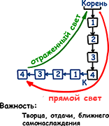 Всё это идет свыше, от прямого света (ор яшар). И только последняя ступень, четвертая в четвертой, может откликнуться отраженным светом (ор хозэр). При этом она сама не понимает, на что откликается. Ведь на обратном пути ее ждет опять-таки непонятное развитие, пока она не доберется до Корня.
