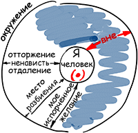Человек помещен в окружение и в то же время отделен, отдален от него чувством отторжения, а затем – ненависти. Всевозможные чувства, сводящиеся к тому, что "есть я и есть окружение", составляют, по сути, место разбиения.