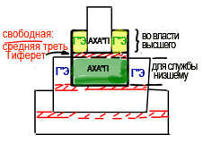 В верхней части своей Г"Э, куда погружен АХА"П высшего, каждый парцуф находится во власти высшего. В нижней части своего АХА"П, спустившегося в Г"Э низшего, каждый парцуф поставлен на службу низшему.