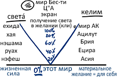 В итоге заканчиваются все светá во всех сосудах, и мы оказываемся внизу, в состоянии "этого мира". Здесь нет ни светов, ни сосудов – только простая жизненная сила, материальное желание. На протяжении всего спуска экран уменьшался со 100% до нуля. В итоге у нас нет силы сопротивления, нет мысли об отдаче, нет ничего. Мы находимся в материальном мире – иными словами, в желании, действующем ради себя.