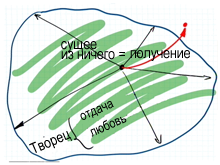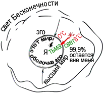 Я нахожусь внутри собственного эго, и свет бесконечности окружает меня. Но когда он светит мне и наносит удары по оболочке эго, то она фильтрует этот свет и передает мне лишь то, что интересует мое эго: хорошее или плохое для меня. От того, что плохо для меня, я отдаляюсь, убегаю, уклоняюсь, а к будто бы хорошим для меня (моего эго) вещам я тянусь и приближаюсь.