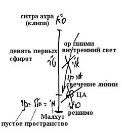 Что касается ситра ахра, нет в ней ничего от девяти первых сфирот и основа построения ее - пустое пространство, что является огромным желанием получать, – тогда эта малхут не называется малхут внешнего кли, а называется пустое пространство, – на которую и было сделано Первое сокращение (Цимцум алеф), – сама малхут не в состоянии сделать на себя сокращение, поэтому на нее было сделано сокращение, – и даже тогда, когда возникло свечение линии внутри решимо, (рис.3) этот корень остался без света. И поэтому она от начала до конца противоположна жизни и духовности, в тайне сказанного: "Одно в противоположность другому создал Творец". И поэтому называется мертвой.