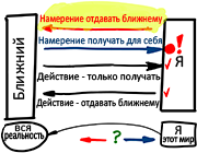 В нашем мире существует действие по получению и действие по отдаче ближнему, а также намерение получать для себя. Только намерения отдавать ближнему здесь нет, только на это я неспособен. Я могу дать кому-то что-то или получить от кого-то что-то, но в намерении я обращен исключительно на получение для себя, тогда как намерение на отдачу ближнему относится уже к духовному миру, и до него я не дотягиваюсь. Это не моя вина, так я устроен.