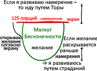 Ведь мое желание очень велико – это Малхут мира Бесконечности. А экраны у меня могут быть разные: от самого малого до самого большого. Величина экрана делится на 125 "порций", и если сообразно с ними я также открываю желание, то постоянно пребываю в равновесии: у меня одно намерение.