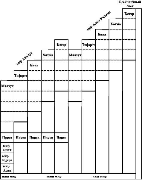 Таким образом, начинают Тору с тайны, пока она не становится явью: соответственно двойное и просто сокрытие Творца или Торы в мире Асия, открытие в мире Ецира, достижение любви к Творцу в мире Брия, совершенное слияние в абсолютной любви в мире Ацилут. И для последовательного, безболезненного, уверенного постижения Творца написана Ари книга "Эц хаим" - "Древо жизни", и на ее основе - монументальный труд рабби Ашлага - "Талмуд Эсер аСфирот".