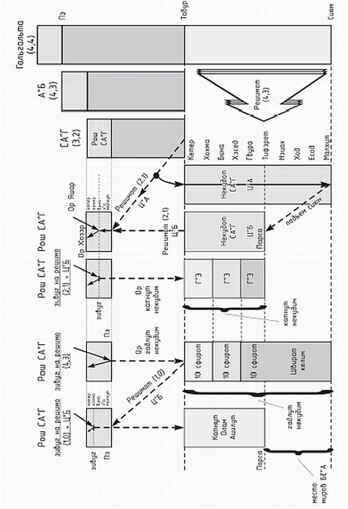 Рис. 4 Парцуф некудот де-Са”Г создал под табуром такое понятие, как место. Что такое место? Это такая сфира, в которой может существовать другая сфира, меньше первой по измерению. Наш мир существует на каком-то месте. Если выкачать из него абсолютно все, всю вселенную, то останется место. Мы этого ощутить не можем. Это просто пустота, которую невозможно измерить, она — в других измерениях. Вместе с нашим миром существуют и духовные миры, все миры сквозные, поэтому их невозможно увидеть, ощутить, т.к. они тоже находятся в других измерениях. На месте Га”Р де-бина под табуром появится в дальнейшем мир Ацилут. Под парсой в нижней части тиферет образуется мир Брия. На месте сфирот нецах, ход, есод возникнет мир Ецира. А на сфире малхут — мир Асия, последняя часть которого называется «этот мир». Как произошли из 5-ти сфирот 10? Кетер, хохма, бина, з”а и малхут: каждая из этих сфирот, кроме з”а, состоит из 10 сфирот. З”А, как маленькое лицо, состоит только из 6-ти сфирот: хесед, гвура, тиферет, нецах, ход, есод. Если вместо з”а подставить его 6 сфирот, то вместе с кетер, хохма, бина и малхут они составят 10. Поэтому иногда мы называем 5 сфирот, иногда — 10. Но нет парцуфа, состоящего из 12 или 9 сфирот. Термины Каббалы не нужно переводить на русский язык. Все они обозначают либо какой-то духовный парцуф, либо его часть. Перевод же может способствовать созданию какого-то образа нашего мира, что строго запрещено. Нельзя низводить духовное до материального. Слова голова, рот, тело, а затем мы познакомимся еще и с такими терминами, как поцелуй, объятие, совокупление и др., могут вызвать в нас ассоциации, не связанные с Каббалой. Я рекомендую сразу запоминать ивритские наименования. У русскоговорящих есть преимущество в этом перед израильтянами: поначалу из-за незнания иврита у них ивритские термины не создают внутреннего видения образов нашего мира. |
