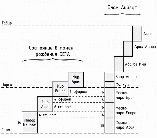 Рис. 5 Порядок исправления состоит в том, что мир Ацилут направляет на каждую неисправленную частичку луч сильного света, выделяет из смешанной частички Г”Э, поднимает ее наверх, а оставшийся АХа”П «отставляет в сторону» как эгоистические келим, не используя их. После исправления миром Ацилут всех Г”Э, малхут мира Ацилут поднимается в бину, т.е. под рош мира Ацилут. Рош мира Ацилут — это Атик, А”А, АВ”И. Там малхут делает: 1) зивуг на бет де-авиют, создавая этим мир Брия; 2) зивуг на алеф де-авиют, создает мир Ецира; 3) зивуг на авиют шореш, рождает мир Асия. Подъем в бину сдвинул мир Ацилут на две ступени вверх: малхут находится вместо Аба ве Има, З”А вместо Арих Анпина, Арих Анпин и Атик поднялись, соответственно, выше. Парцуф малхут мира Ацилут, который эквивалентен в этом подъеме бина, Аба ве Има, может создавать новое, рожать. Так рождается от малхут дэ Ацилут мир Брия и занимает новое место вместо З”А мира Ацилут, под головой, которая его родила: как всегда, рожденный на одну ступень меньше рождающего его. Затем рождается мир Ецира. Он своей верхней частью, 4-мя первыми сфиротами, занимает место малхут мира Ацилут, а его нижняя часть, 6 нижних сфирот, соответственно располагаются там, где место первых 6 сфирот мира Брия. Следующий мир — Асия — расположен от половины места мира Брия до половины места мира Ецира. Пустыми остаются четыре сфиры мира Ецира и 10 сфирот мира Асия. Место, которое остается пустым, называется мадор клипот, место нечистых сил. Еще раз пройдем по изложенному материалу: вышел мир Некудим в катнут с рош-кетер, рош-аба ве има, Зо”Н-гуф. И все это называется гальгальта ве эйнаим, и занимает место от табура до парсы. Затем начал выходить гадлут мира Некудим, в каждой части которого есть 10 сфирот, в рош и гуф. Гадлут вышел в кетер, в аба ве има, а когда Зо”Н захотел получить гадлут, мир Некудим сломался. Все келим гуф разбились на 320 частей, упали под парсу и перемешались между собой, образовав четыре группы: 1) Г”Э, 2) АХа”П, 3) Г”Э в АХа”П, 4) АХа”П в Г”Э. Для исправления разбитых келим создается мир Ацилут. Сначала рождаются три его первых парцуфа: Атик, Арих Анпин, Аба ве Има, которые полностью соответствуют парцуфим Кетер, Аба ве Има в мире Некудим. Зэир Анпин и Малхут соответствуют тем же парцуфим в мире Некудим. На этом полностью оканчивается исправление извлеченных келим Г”Э из всех 320 частей. Далее — Г”Э внутри АХа”Пов нельзя отделить, но можно направленным на нее лучом света передвинуть ближе к свету. Ацилут хочет сделать исправление в АХа”П. Малхут поднимается в бину и рождает там 10 сфирот мира Брия, который находится на месте З”А мира Ацилут, т.к. сама Малхут мира Ацилут находится в Аба ве Има. Затем рождаются 10 сфирот мира Ецира, который частично перекрывает мир Брия, а часть мира Ецира находится под парсой на месте верхней половины мира Брия. И, наконец, мир Асия находится от половины места мира Брия до половины места мира Ецира. Начиная с середины места мира Ецира и кончая полностью местом мира Асия, находится пустота, мадор клипот. Затем мы увидим, что миры смогут подниматься и опускаться, но всегда все вместе относительно их первоначального места. Все, что я вкратце рассказал, изложено примерно на полутора тысяч страниц ТЭ”С. Этот материал представляет собой инструкцию продвижения в духовных мирах, и он вызовет соответст