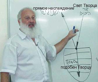 Рис.2 То есть, как мы уже говорили, передо мной – стол с угощениями, на котором я вижу пять блюд – пять видов наслаждений, которые Творец желает дать мне. В терминах наших органов чувств: зрение, слух, обоняние, вкус, осязание. В духовном мире это: кетер, хохма, бина, зеир-анпин, малхут (входящий в них свет: нефеш, руах, нешама, хохма, йехида – НаРаНХаЙ). Кроме того, в зале находится Творец. Тогда моё кли, желание к удовольствиям, заключенным в том, что лежит на столе – это обычное кли. Вначале это кли с авиютом алеф (мерой «толщины», «грубости», равной единице), затем, после его постижения – бет (2), гимель (3). Но на четвертой стадии, когда кли приобрело авиют далет (4), желание увеличилось: теперь это – желание быть таким, как Творец. Творение желает стать на Его место. Желает быть точно таким, как Он, а не наслаждаться светом, из Него исходящим. Разница между этими желаниям очень велика. Итак, таково желание четвертой стадии, бхины далет... Да, это желание насладиться положением Творца. Мы еще обсудим подробнее, что это за желание, какова его природа, каков его вид... Что же происходит дальше? Мы выяснили, что бхина далет – это очень большое желание получить, и теперь творение работает с этим желанием. Бхина далет начинает получать. Перед ней находятся: корневая, первая, вторая, третья – стадии. Начав получать (а мы уже говорили о том, что получение – это постижение того, что находится перед получающим), бхина далет постигает предыдущие стадии. Вначале – третью стадию. Затем третья – «опускается», и входит вторая. Теперь третья и вторая опускаются, и приходит первая. Затем все они снова опускаются, и приходит бхинат шореш, корневая стадия. Таким образом, получается, что бхина далет содержит все бхинот: шореш (то место, где она ощущает шореш), алеф, бет, гимел и далет. Всё это – в самой бхине далет. Во всех частях, предшествующих последней (далет), бхина далет ощущает свойства Творца. В последней же, собственной части она ощущает саму себя, т.е. свойства творения. И тогда она начинает чувствовать огромную разницу, пропасть, между свойствами Творца и творения, которые она ощутила. Эта разница называется стыд. Ведь творение теперь ощущает одним и тем же кли свойства Творца и творения – пропасть между собой и Творцом! Это ужасное ощущение приводит бхину далет к сокращению, цимцуму.